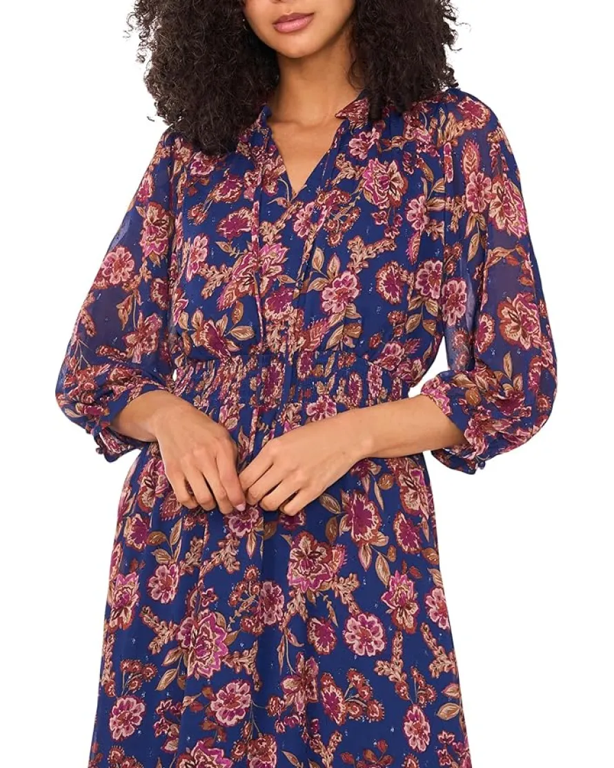 - The Vince Camuto® 3/4 Puff Sleeve Tie Neck Maxi Dress is a graceful blend of floral print and modern charm. Featuring soft three-quarter-length puff sleeves and a tie-neck closure, this maxi dress offers a flattering A-line silhouette that moves effortlessly from day to evening. The flowing skirt adds ease, while the smocked waist and gathered neckline lend a classic flair.