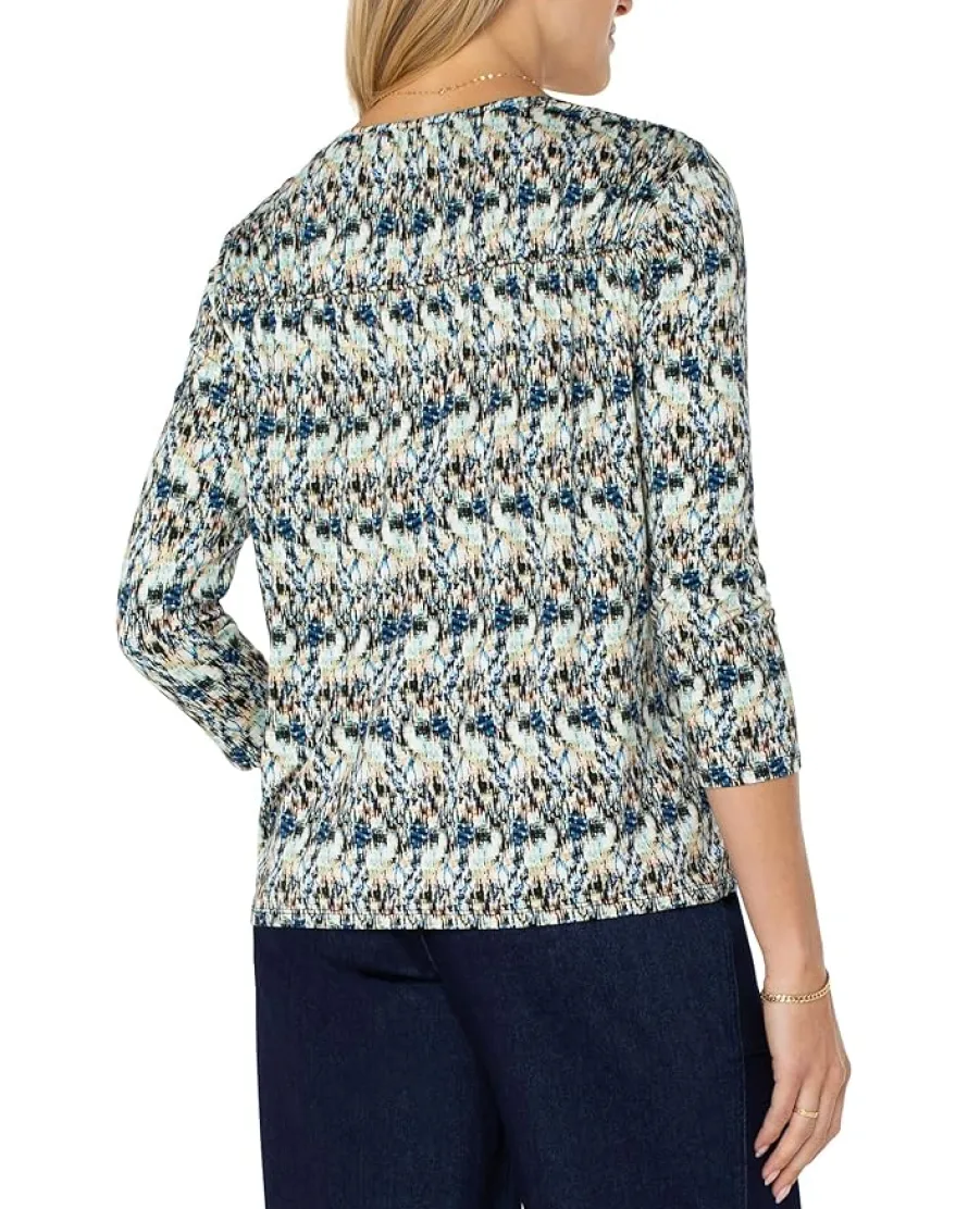 - Make a gorgeous statement by donning the Liverpool Los Angeles™ 3/4 Sleeve Shirred Detail Knit Top with a fun print. The lightweight, classic-fit jersey knit top features a round neckline, three-fourth sleeves, shirring detailing, and a standard-length silhouette with a straight hem. It provides both comfort and breathability with a beautiful drape for versatile day-to-night wear without sacrificing ease of movement.