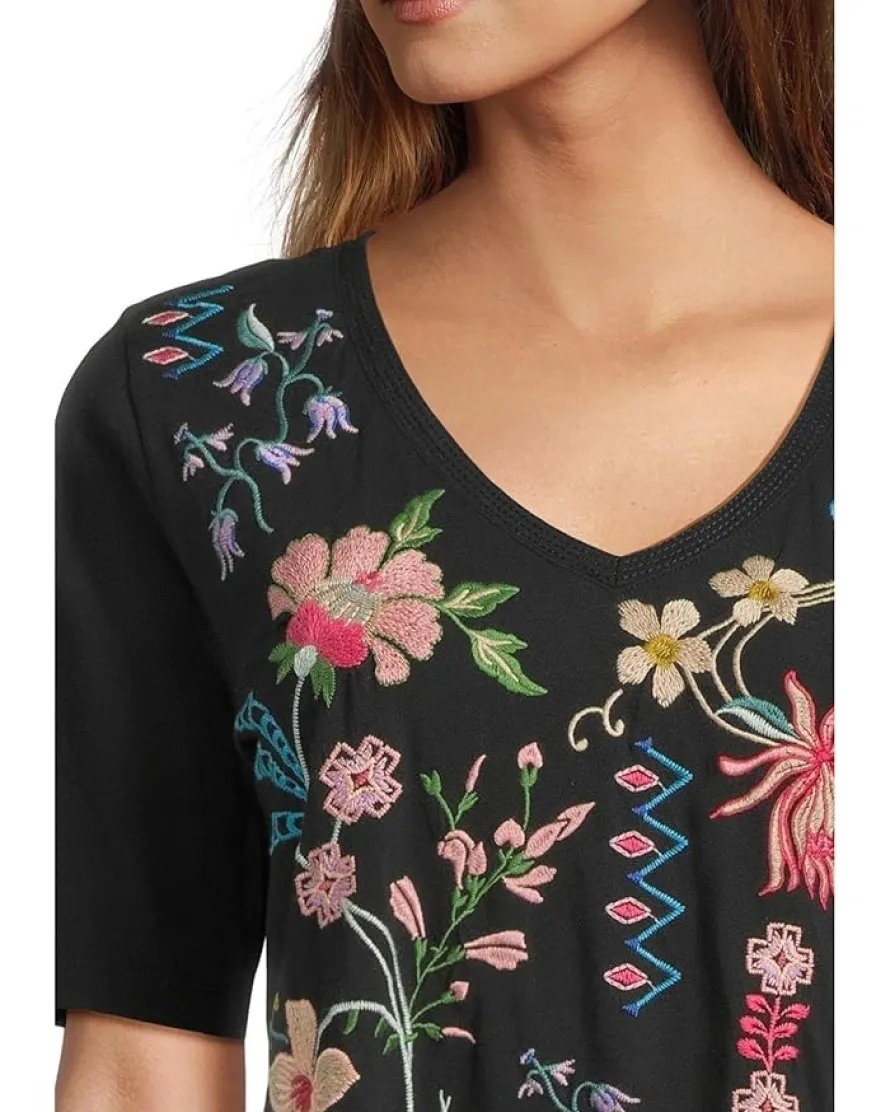 - The Johnny Was® 3/4 Sleeve Trapunto V-neck Tee is an elevated alternative to a classic tee. Featuring a V-neckline, this pull-on tee offers short sleeves and is finished with vibrant embroidered floral detailing for a splash of color.