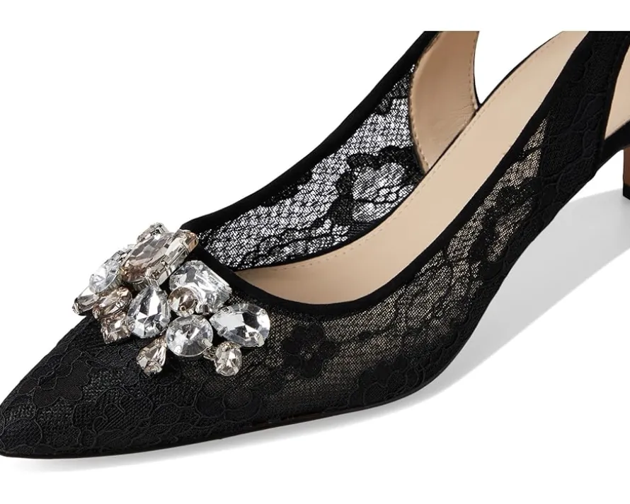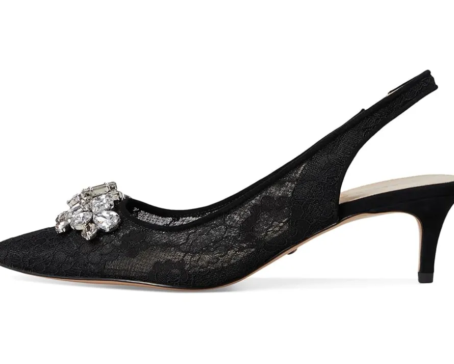 - Stun everyone with your elite taste in fashion wearing Pelle Moda® Adenn Pumps. The slip-on style pumps are designed with a suede upper with crystal embellishments & lace, faux leather lining, and a suede insole. The slingback strap allows easy on/off and the kitten heel elevates the look.