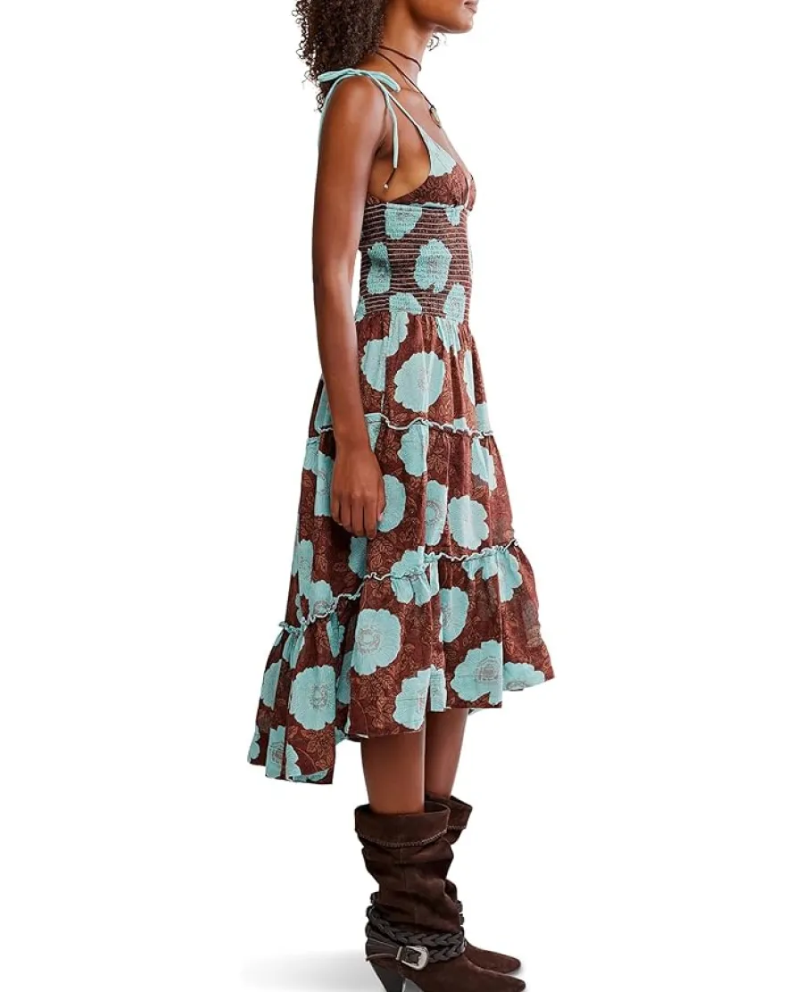 - Breezy and romantic, the Adriel Midi Dress by Free People™ captures the essence of effortless femininity. Featuring a flattering scoop neckline, adjustable tie straps, and a smocked bodice for a comfortable fit, this tiered silhouette dress flows gracefully with every step. The ideal piece to take you from your daytime event to a night out on vacation, this versatile floral-printed dress is sure to be your go-to pick for a head-turning look.