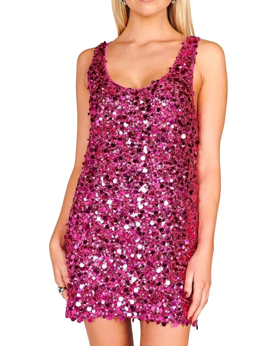 - Dance the night away wearing the Show Me Your Mumu™ After Hours Mini Dress that features allover silver metallic sequins. Designed with a V-neckline, scoop back, mini hem length, and a sleeveless style, this printed dress is just fun. Wear this glamorous dress with a dainty heel and simple accessories for a perfect look.