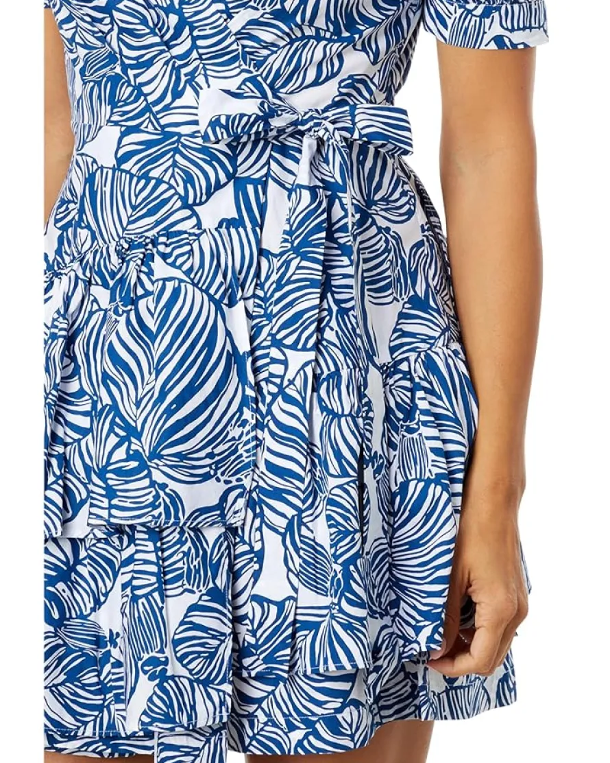 - Let your personality shine in a new color by wearing Lilly Pulitzer® Alexandria Elbow Sleeve C dress. The flare wrap skirt makes this dress unique. It is designed with a surplice neckline, waist tie, and elbow-length sleeves with pleated details. A tiered ruffle at the skirt lets you move freely outdoors. It is printed stylistically with oversized leafy design.