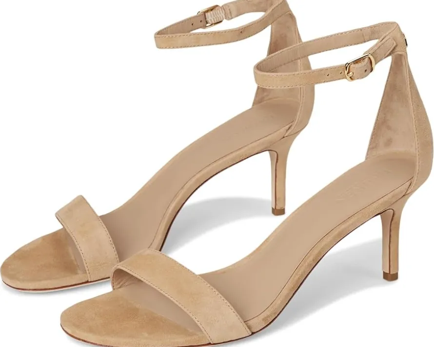 - A polished “LRL” logo accents the vamp of the Lauren Ralph Lauren® Allie Mid-Heel Suede Sandals, which feature a thong silhouette in an eye-catching, metallic Nappa leather upper. These heeled sandals are made of a padded leather insole and leather lining. The buckled ankle strap offers a secure fit. Walk with confidence wearing these leather heels.