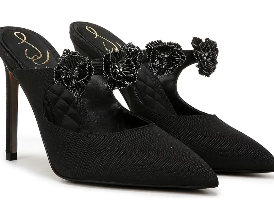 - With beaded floral detailing and a pointed toe, the Sam Edelman® Amelie Dress Mule is a fall-forward classic that pairs with everything from cropped denim to cocktail dresses. The slip-on footwear features polyester upper with sleek stiletto heel and pointed toe silhouette.