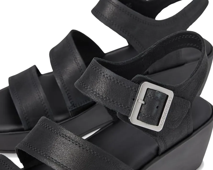 - Look chic and comfortable in the Rockport® Anala wedge sandals. It offers a strappy silhouette, open toe design, and an adjustable ankle strap for a secure fit. These sandals will keep you looking stylish all day and night. Featuring truTECH® technology for lightweight shock absorption. The sandals feature leather upper, polyester lining, and foam insole.