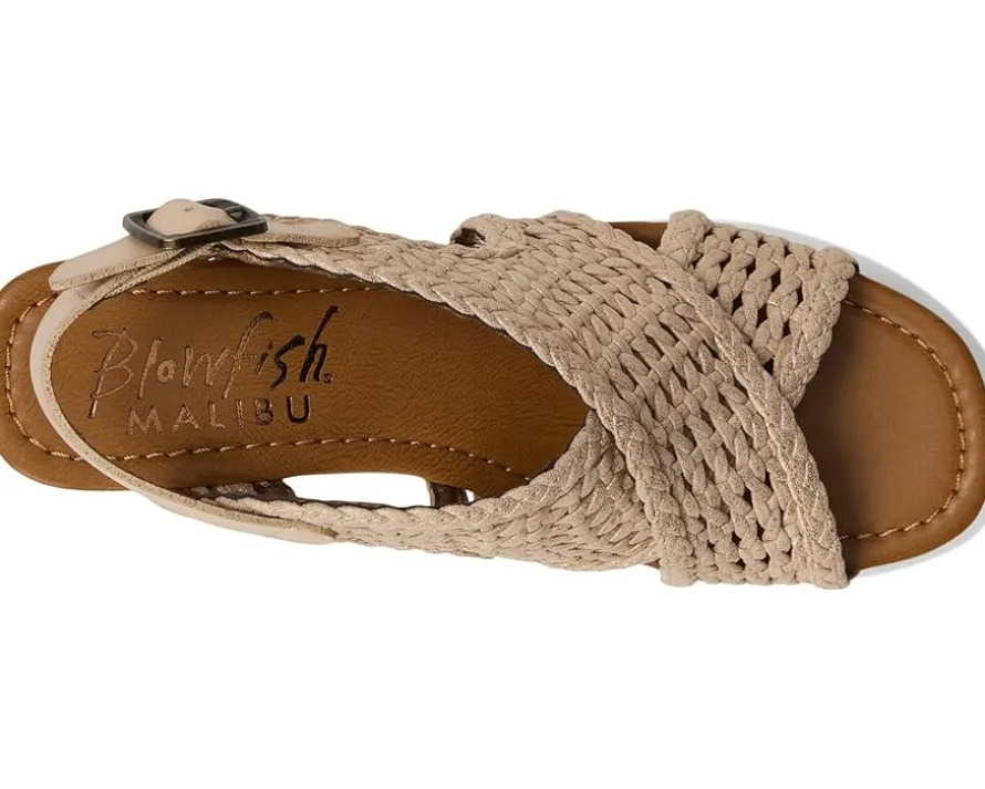 - These Blowfish® Malibu Andrea Wedge Sandals are the key to breezy island style – where boho aesthetic meets surefit comfort. Fashioned to take your resort wear to new heights, this wedge sports a stylish macramé-inspired faux-leather or fabric upper for an artisan quality. A sturdy buckle closure on the adjustable slingback ankle strap provides an on-point fit, and the square toe offers contemporary flair. The shoe is topped off with a rope-wrapped platform and wedge heel for the perfect height, while the plush foam insole and PU lining keep every step cushioned. Finished with a durable synthetic rubber outsole, this sandal is vegan and ready for sun-soaked adventures!