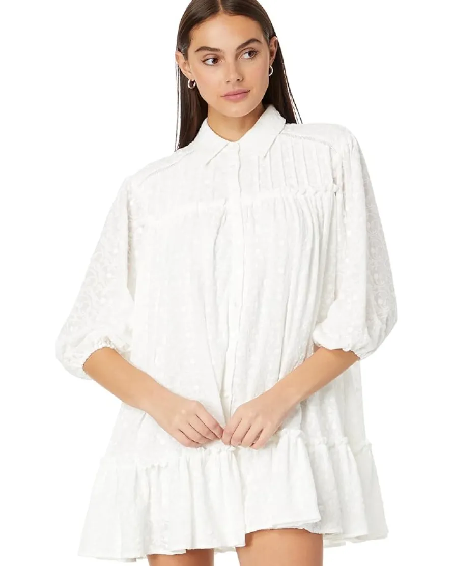 - Stylish and chic, the line and dot® Angelica Mini Dress is the perfect addition to your closet, making you stand out from your everyday casual look. The dress has a collared neckline, elbow sleeves, button closure, and flared hemline with a frill silhouette for a classy touch. The intricate detailing allover elevates the look effortlessly.