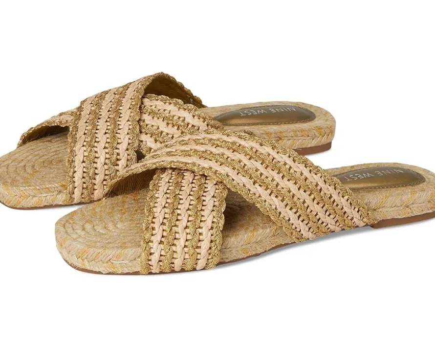 - Step up your shoe game in the Nine West® Animay casual sandals. These slip-on sandals are made of a polyurethane upper, cushioned insole, and cotton lining. They feature a slip-on silhouette, criss-cross straps, and a round-shaped toe. These slide sandals are anything but boring.