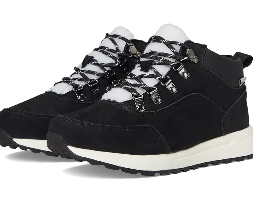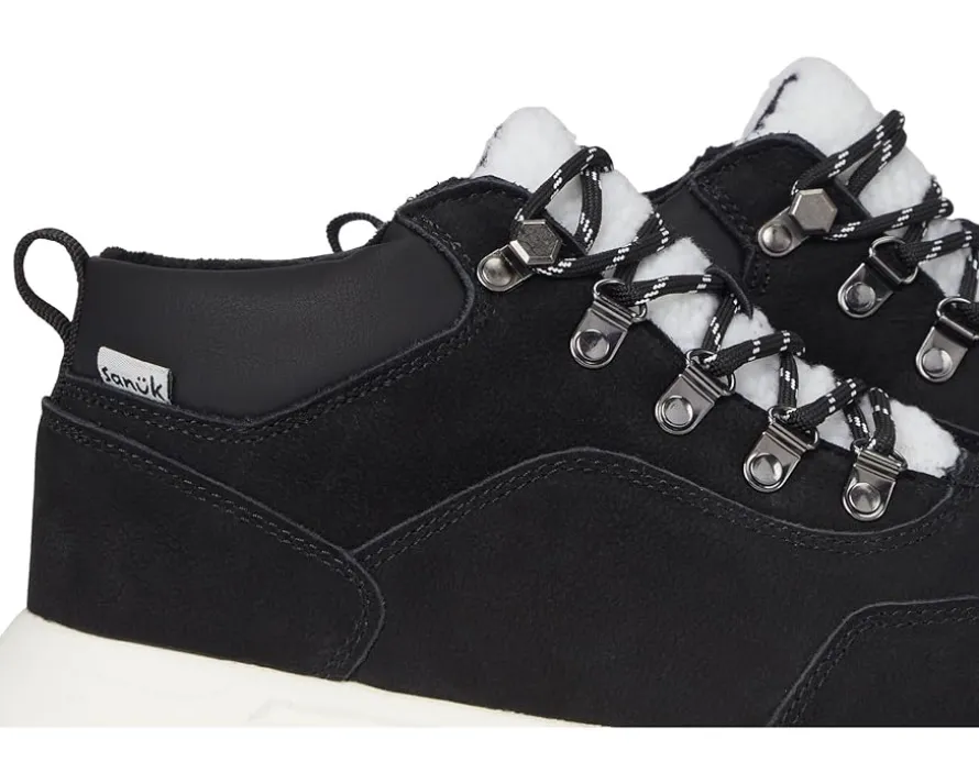 - Take every step with improved comfort and style wearing the Sanuk® Apres Me Shoes. Tropically applied water-repellent treatment combines with this nubuck mid-cut construction, along with faux shearling tongue, toe, and heel protection. Gusseted tongue helps to keep the elements out. High pile fleece lining keeps the coziness in, while the athletic midsole paired with durable rubber outsole allows for easy outdoor transition.