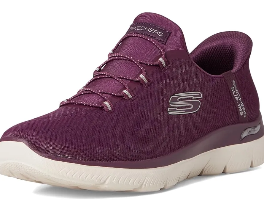 - Enjoy an easy-on brand favorite, now with our famous arch support, wearing SKECHERS® Arch Fit® Summits Hands Free Slip-Ins®. Designed with our exclusive Heel Pillow®, this vegan slip-on has been granted the APMA Seal of Acceptance and features a leopard print mesh upper with fixed stretch laces and a removable air-cooled Arch Fit® insole.