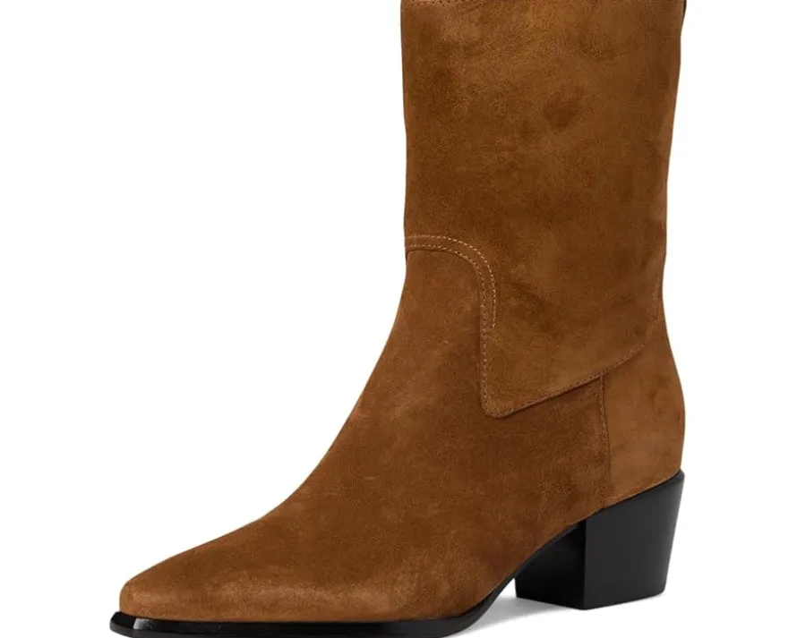 - Crafted from suede leather, the Western-inspired boot is endlessly walkable thanks to its low block heel. Crafted from leather lining and a foam insole for all-day comfort, these booties feature a pull-on style in a pointed toe silhouette and a pull tab in back for easy entry.