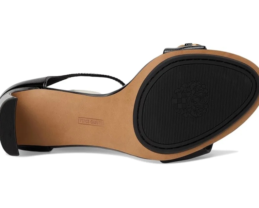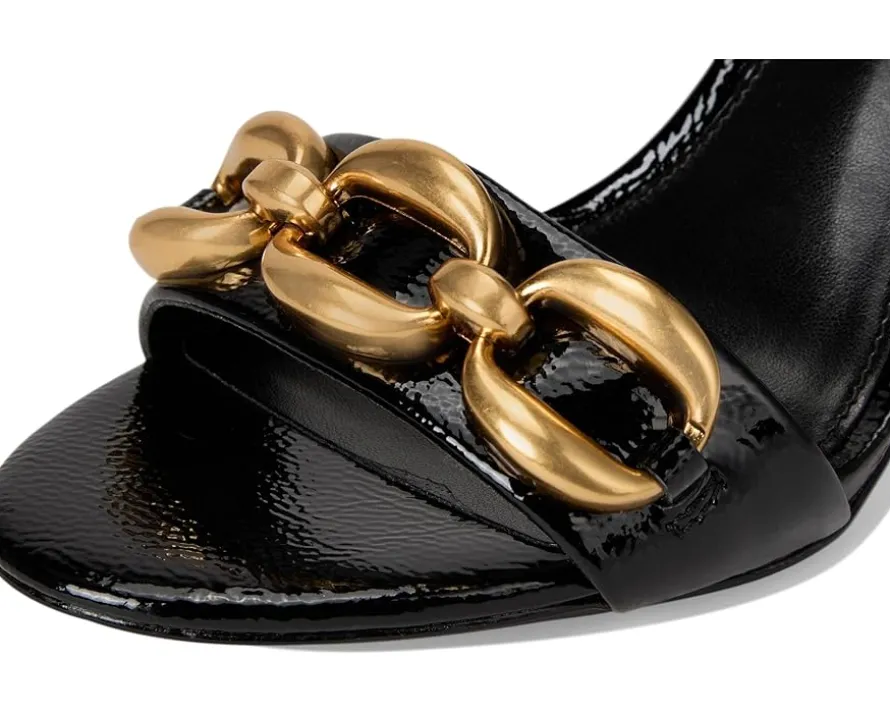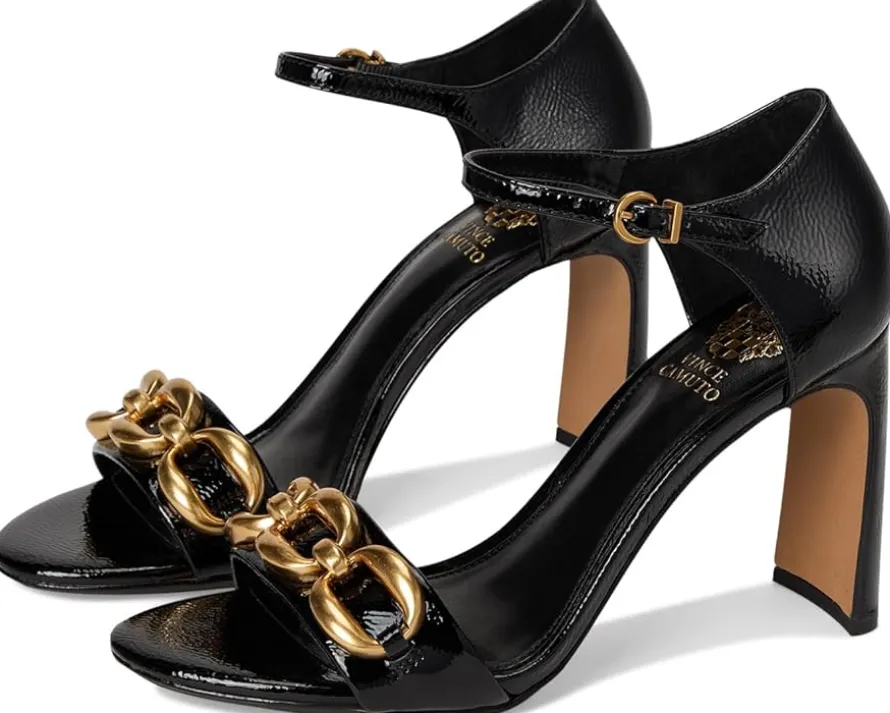 - These glamorous and sophisticated Vince Camuto® Aurelia Chain Link High Heel Sandals are available in a variety of finishes- patent, metallic, croc, and leopard. The sleek, open-toe design is elevated by a bold gold chain embellishment on the front strap, adding a touch of luxe detail. A delicate ankle strap with a goldtone buckle closure ensures a secure and adjustable fit, while the high blade heel enhances the shoe’s elegant silhouette. Crafted from luxe leather upper, this sandal is perfect for special occasions, effortlessly complementing evening gowns, cocktail dresses, or chic tailored looks. A true statement piece for any wardrobe.