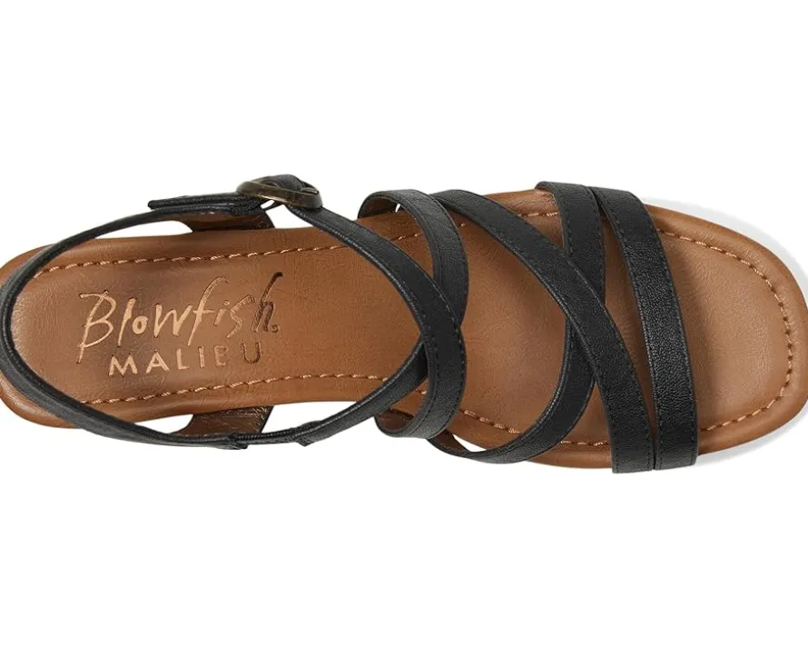- Update your footwear collection by adding to it the stunning Blowfish® Malibu Aurora Heels. The strappy sandals feature a faux leather upper with a metal buckle closure, polyurethane lining, and a foam insole for lasting comfort. The cork wedge wrap heel adds to the style.