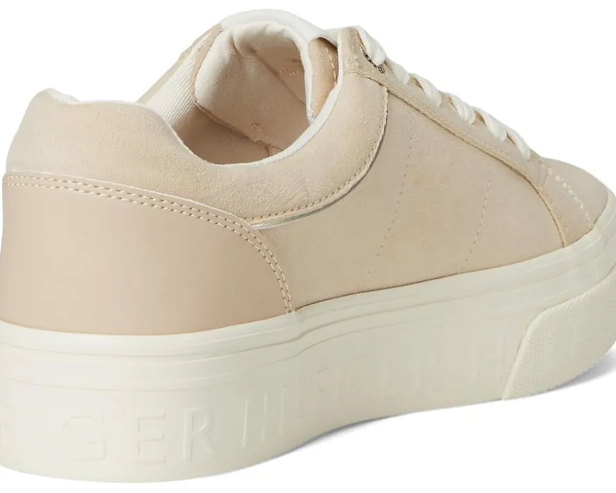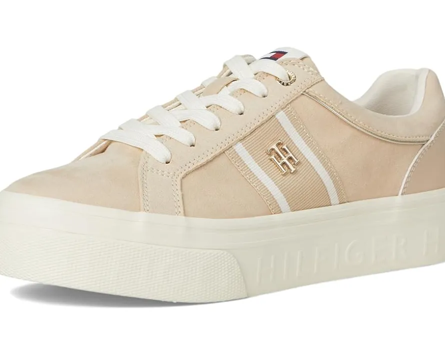 - Stylish and comfortable, the Tommy Hilfiger® Badria Sneakers add a touch of sporty glamour to almost any look and will be a great addition to your wardrobe. The low-top, round-toe sneakers are designed with a polyester upper, polyester lining, and polyester insole. The branded logo hardware and signature ribbon offer authenticity and the lace-up closure ensures a secure fit.