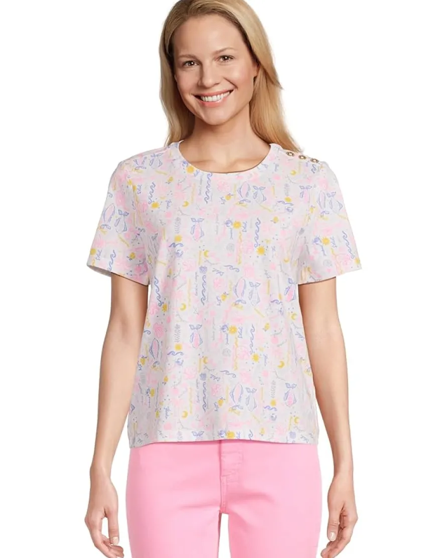- The Lilly Pulitzer® Barreto Knit Top is a vibrant wardrobe staple with a playful twist. Featuring a straight fit, crew neckline, and short sleeves, this top stands out with its colorful printed details and stylish, branded buttons at the left shoulder. Perfect for pairing with your favorite shorts or skirts, it brings effortless charm to any casual look.