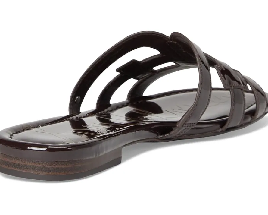- The Sam Edelman® Bay Slide Sandal is warm-weather chic. Versatile and easy to match, this slip-on style sandal for women looks great from poolside to the polo grounds. These come with a leather upper with intricate cut-out details, polyurethane lining, and a polyester insole. Designed to stand out, these leather slide sandals with cutoff jeans or a simple, flowing sun dress