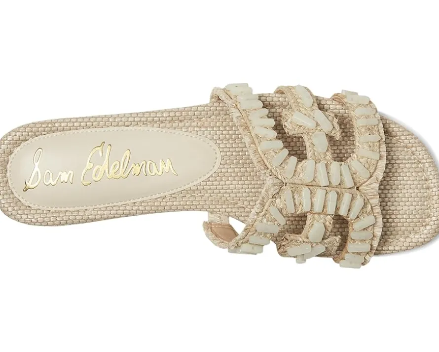 - The Sam Edelman® Bay Stone slides are warm-weather chic. Versatile and easy to match, they look great whether it’s a day at the pool or lunch with friends. These slide sandals are made of a polyurethane upper, leather insole, and polyurethane lining. Adorned with an iconic double “E” logo, these flat sandals can be worn with cutoff jeans or a simple, flowing sundress.