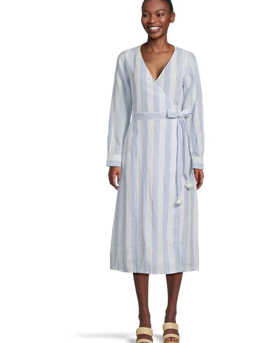 - Make weekend getaways more fun and stylish donning the Tommy Bahama® Bayside Isle Wrap Dress. The pull-on style dress features a V-neckline, long sleeves with barrel cuffs, an adjustable belt at the waist, and a wrap-style silhouette. It features a timeless striped print allover, two slit pocket for added functionality, and a sophisticated below-the-knee silhouette.