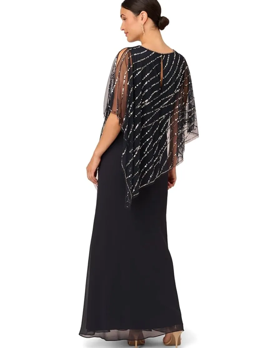 - Be dazzled up for the prom in your modern look wearing Adrianna Papell® Beaded Popover Midi Dress. It features a V-neckline with a sequin-embellished sheer chiffon asymmetrical cape and soft A-line maxi skirt.