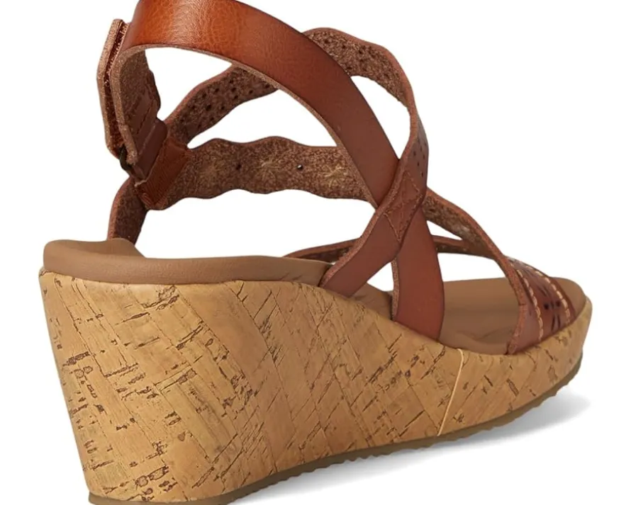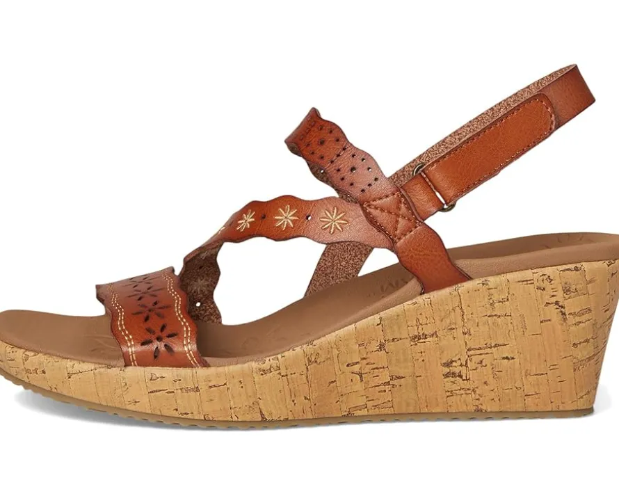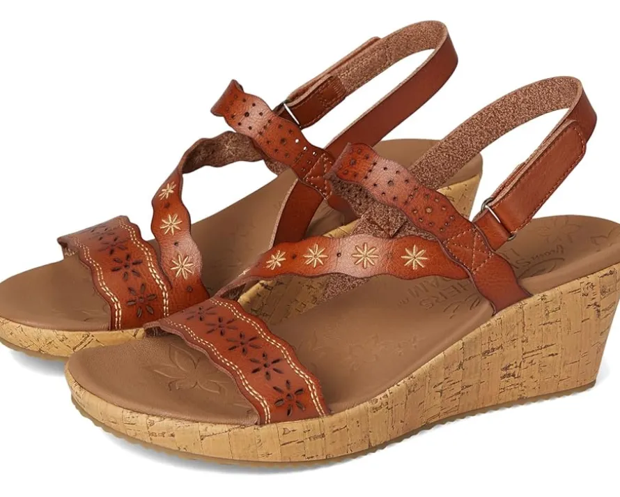 - The SKECHERS® Beverlee – Cherished Aura is built for motion. This strappy vegan wedge sandal features an embroidered and laser-cut synthetic upper with an adjustable back strap and a cushioned Luxe Foam® footbed. It comes with open round toe, wedge heel, and slip-on style.