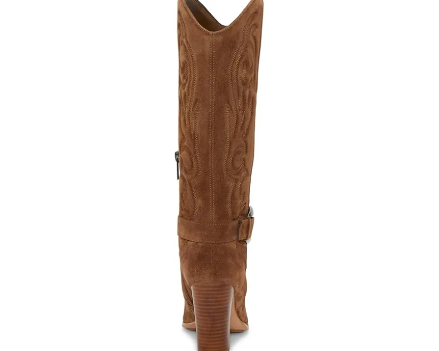 - Step into sophistication styling Vince Camuto® Biancaa Booties! Featuring a chic suede upper and knee-high length, these booties offer style and comfort with a polyester lining and insole. The pointed toe and ornate puffed stitch detail add elegance, while the oversized buckle and scalloped topline make a bold statement. Complete with a durable rubber outsole and side zippered closure for ease, these booties are your go-to for effortless fashion.