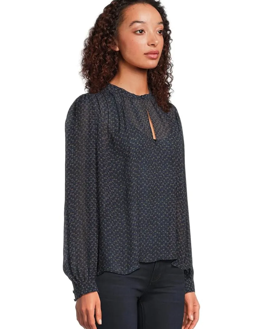 - Crafted from 100% viscose georgette in an allover ditsy floral print, the Paige® Bibiana Blouse is designed with a crew neckline, a center front keyhole, and shirring details. The long sleeves, buttoned cuffs, and straight hem add to its style. Pair this printed top with any shade of denim.