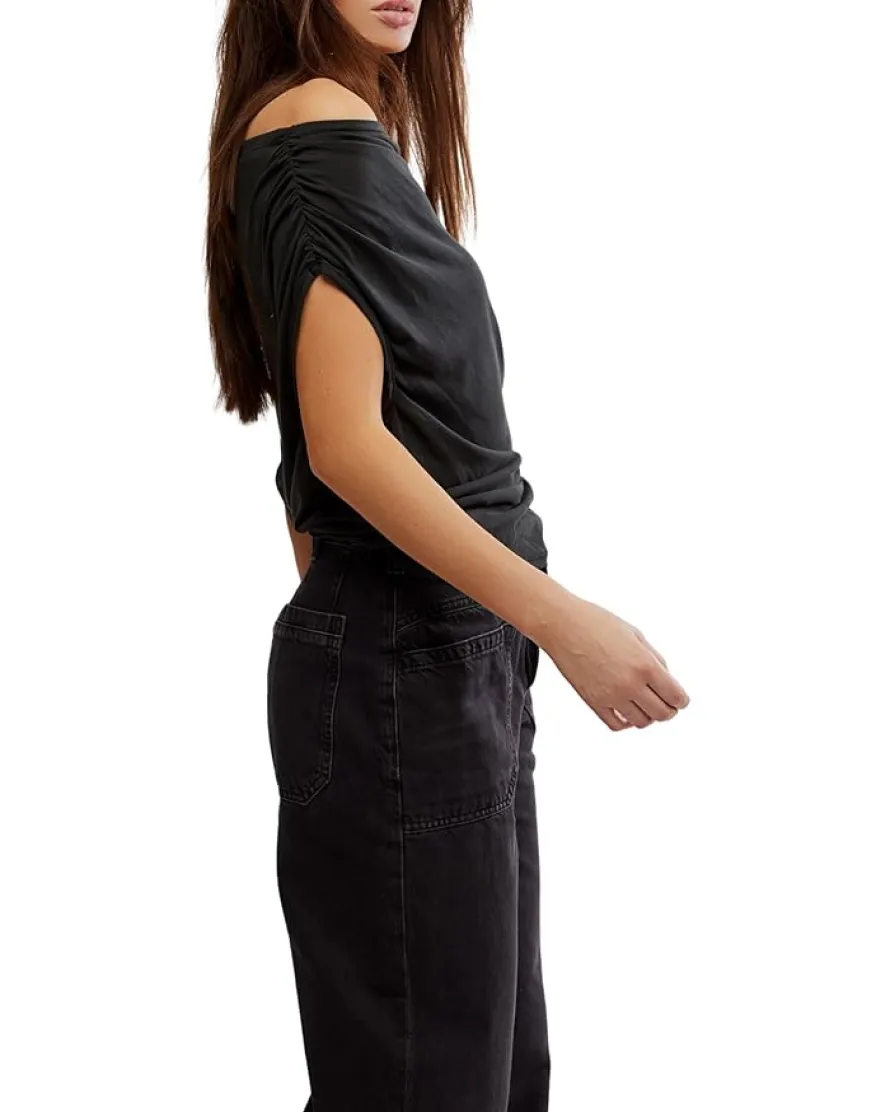 - The Free People™ Blake Knit Top brings together easygoing elegance and trend-forward charm with its relaxed, drapey fit and irresistible slinky jersey fabrication. Designed for those who live for effortless style, this top features a sultry off-the-shoulder neckline that frames the collarbones just right, while delicate ruched detailing adds a touch of playful texture. Draped to perfection, it cascades with a fluid silhouette that flatters every curve, making it the go-to piece for dressing up denim or layering over your favorite bralette.