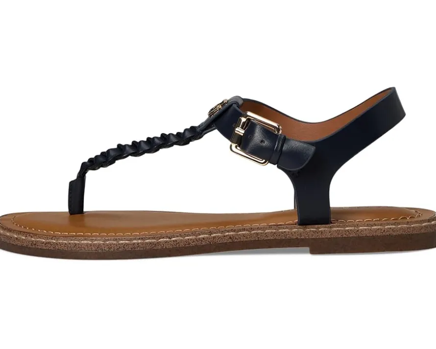 - The Tommy Hilfiger® Blayke sandals boast an up styled thong silhouette, secured with a back strap and side buckle closure. The updated braided thong with a metallic monogrammed hardware is the perfect finishing touch. These low-top flats feature a polyurethane upper, polyester lining, and a leather insole.