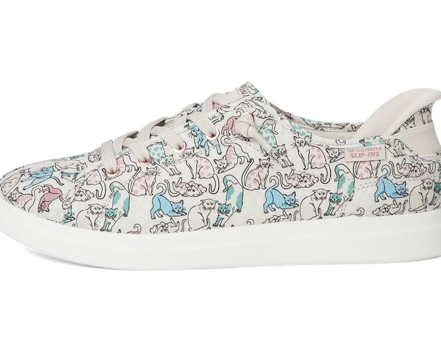 - Slip into blissful comfort and style choosing the BOBS from SKECHERS® Bobs D’Vine Hands Free Slip-ins. Crafted from canvas upper with allover ‘Pattern Kitty’ print and tied-off deco laces. The plush Skechers Memory Foam™ cushioned comfort insole and Exclusive Heel Pillow™ technology hold your foot securely and provide cloud-like comfort.