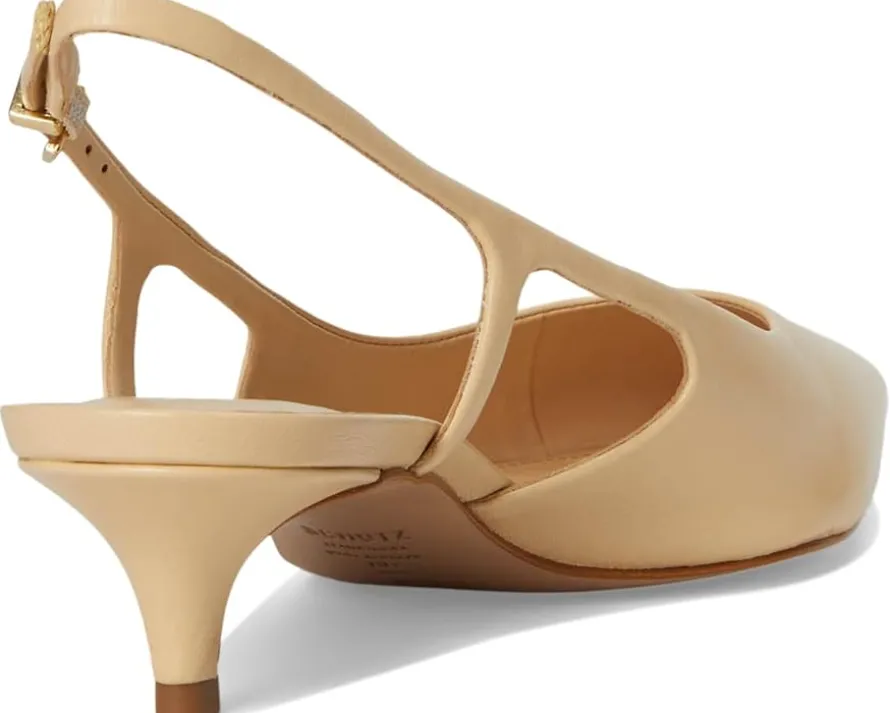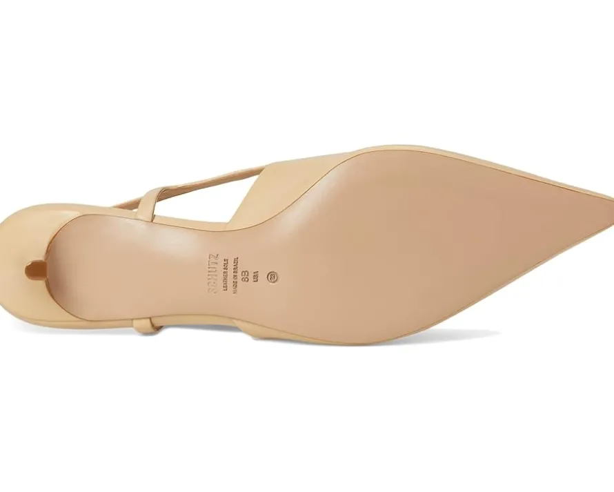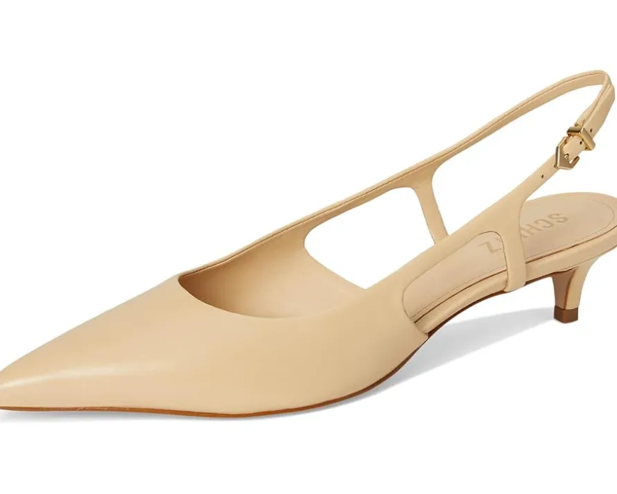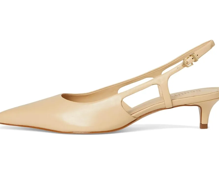- Unleash the sophistication within wearing the Schutz® Boris Kitten. Crafted from leather upper, lining, and EVA insole, this pair of sandals features pointed toe, kitten heels, mid-top silhouette, sling back strap with buckle closure, and brand detailing on the footbed.