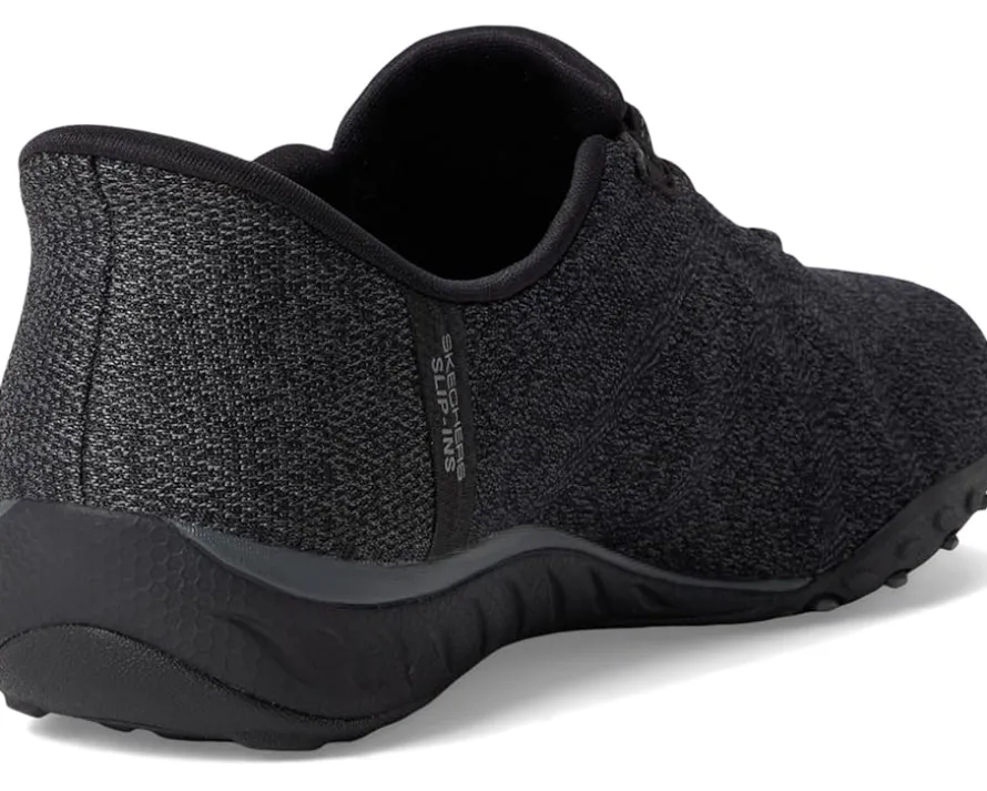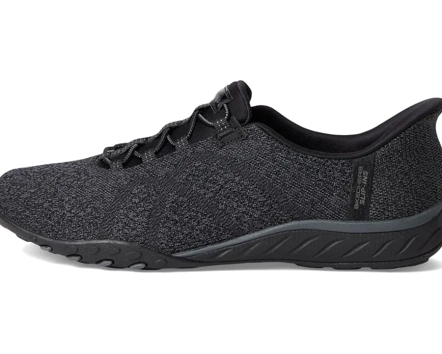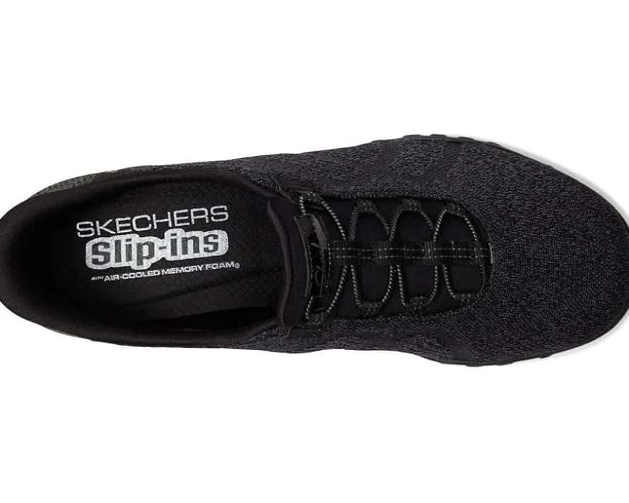 - Simply step-in and go with comfort and style wearing the SKECHERS® Breathe Easy – Knitty Waves Hands Free Slip-Ins. Designed with the exclusive Heel Pillow™, this TOUCHLESS FIT style features a soft knit mesh upper and a cushioned Skechers Air-Cooled Memory Foam insole. Featuring round toe, bungee lace detailing, No-Tie Fit™, low-top silhouette, and brand detailing on the footbed.