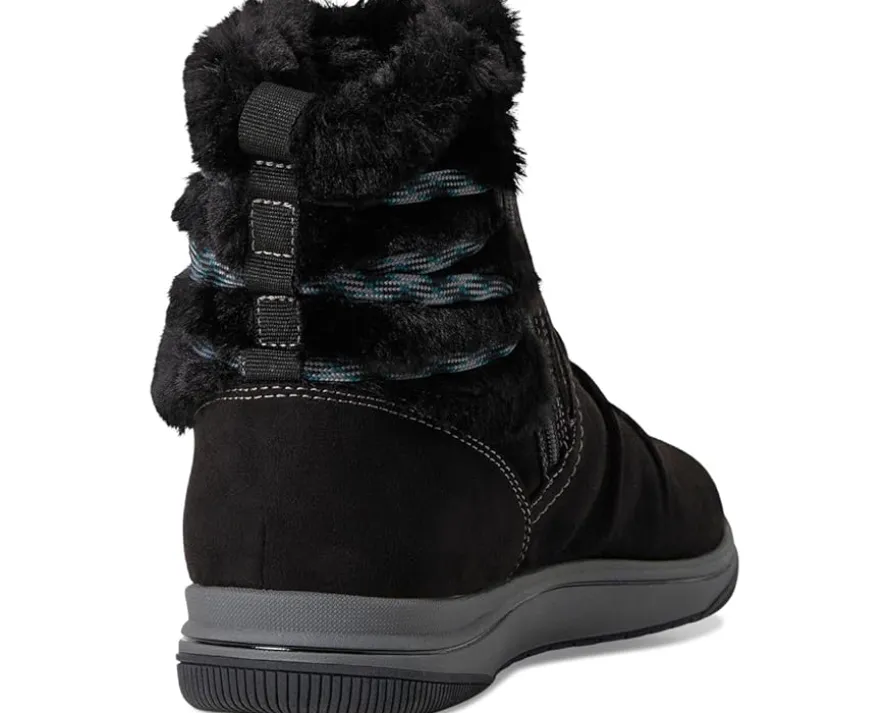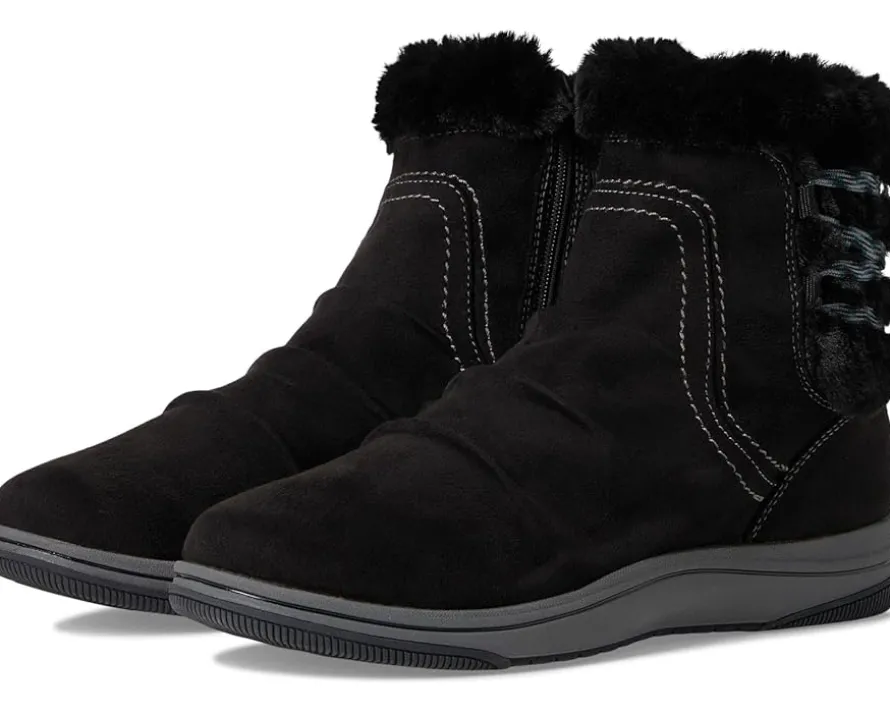 - Keep your feet warm and comfortable by wearing the Clarks™ Breeze Cozy Boots. The ankle-high boots come with a synthetic upper, insulating faux fur lining, and a removable Cushion Soft™ footbed that delivers customizable, targeted support. The easy slip-on style with lace-up details at the back allows a secure fit.