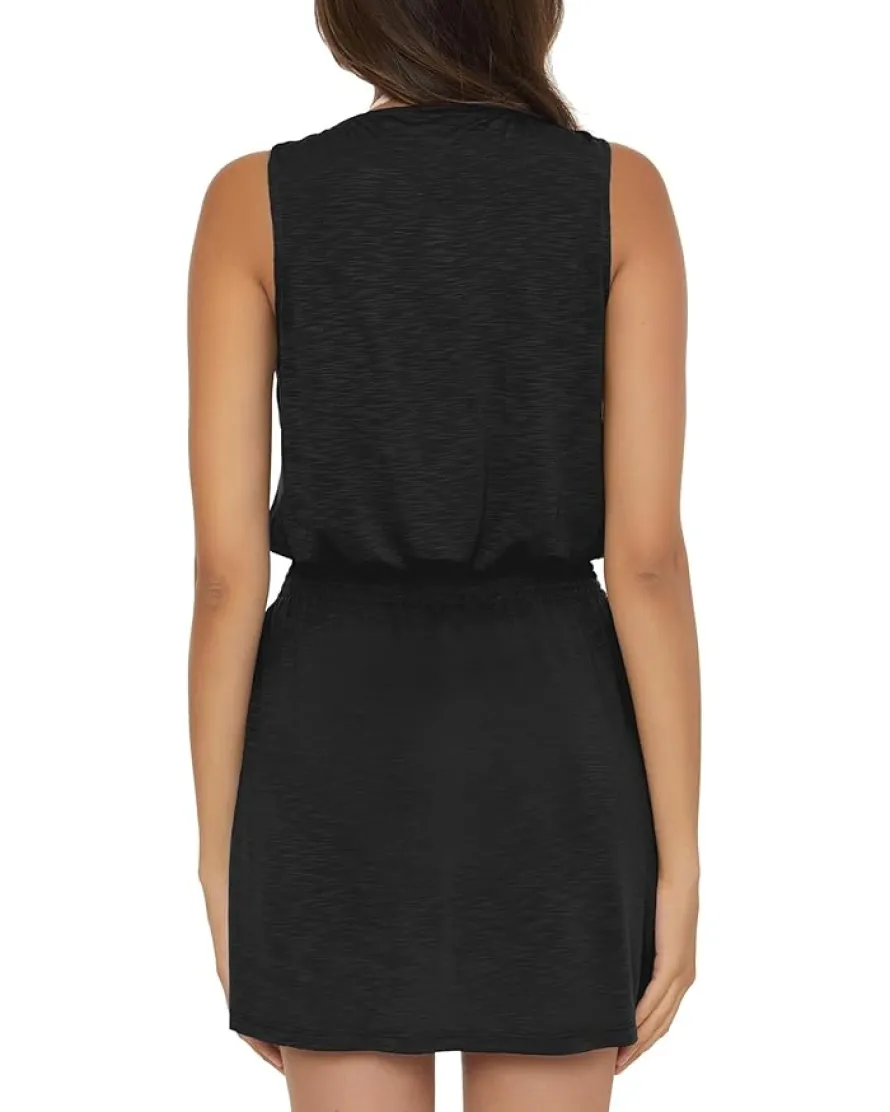 - Be on the fashion move any day wearing BECCA by Rebecca Virtue® Breezy Basics Square Buckle Plunge Neck Dress. It features a V-neckline with gold buckles along shoulder straps and smocked blouson waist.