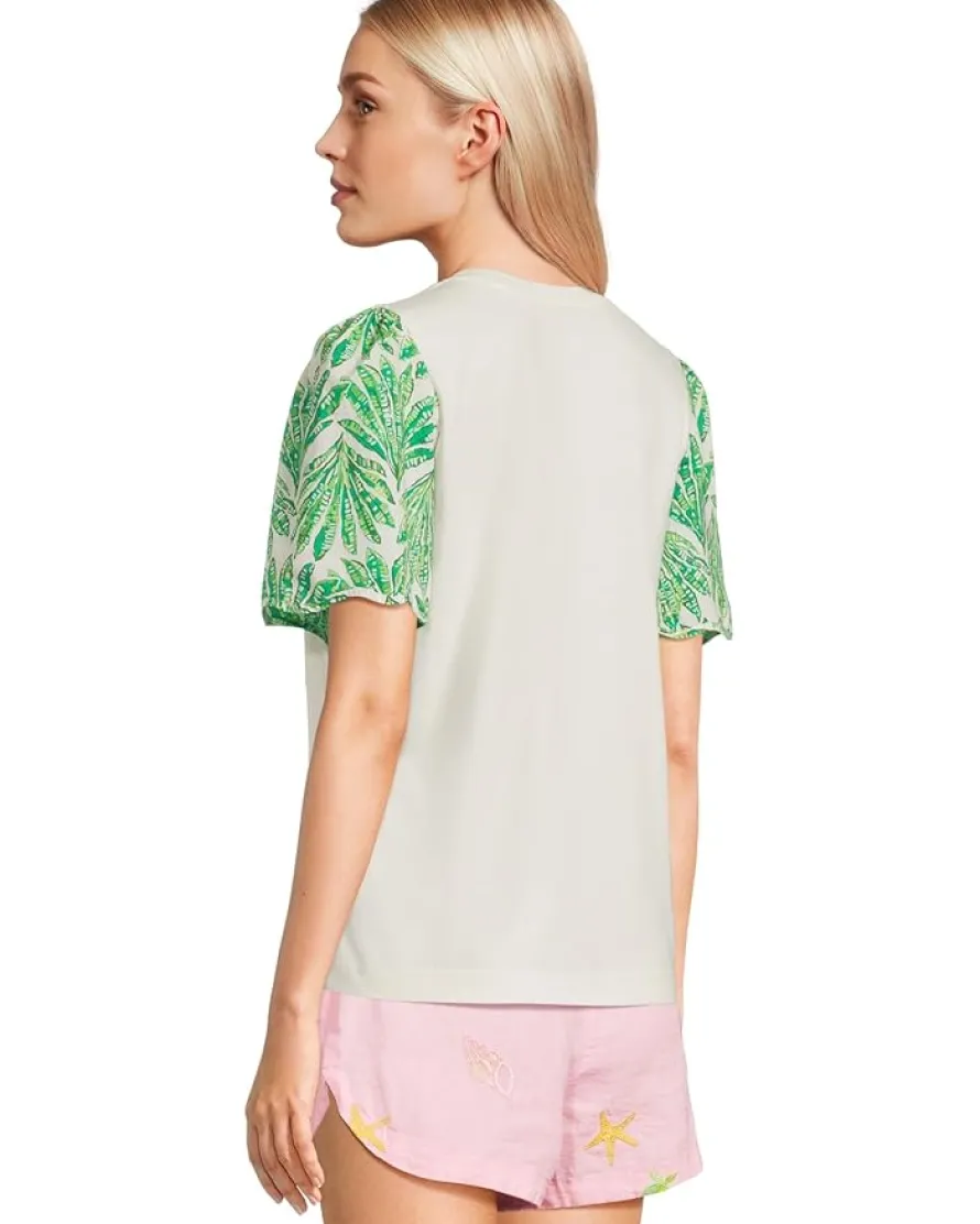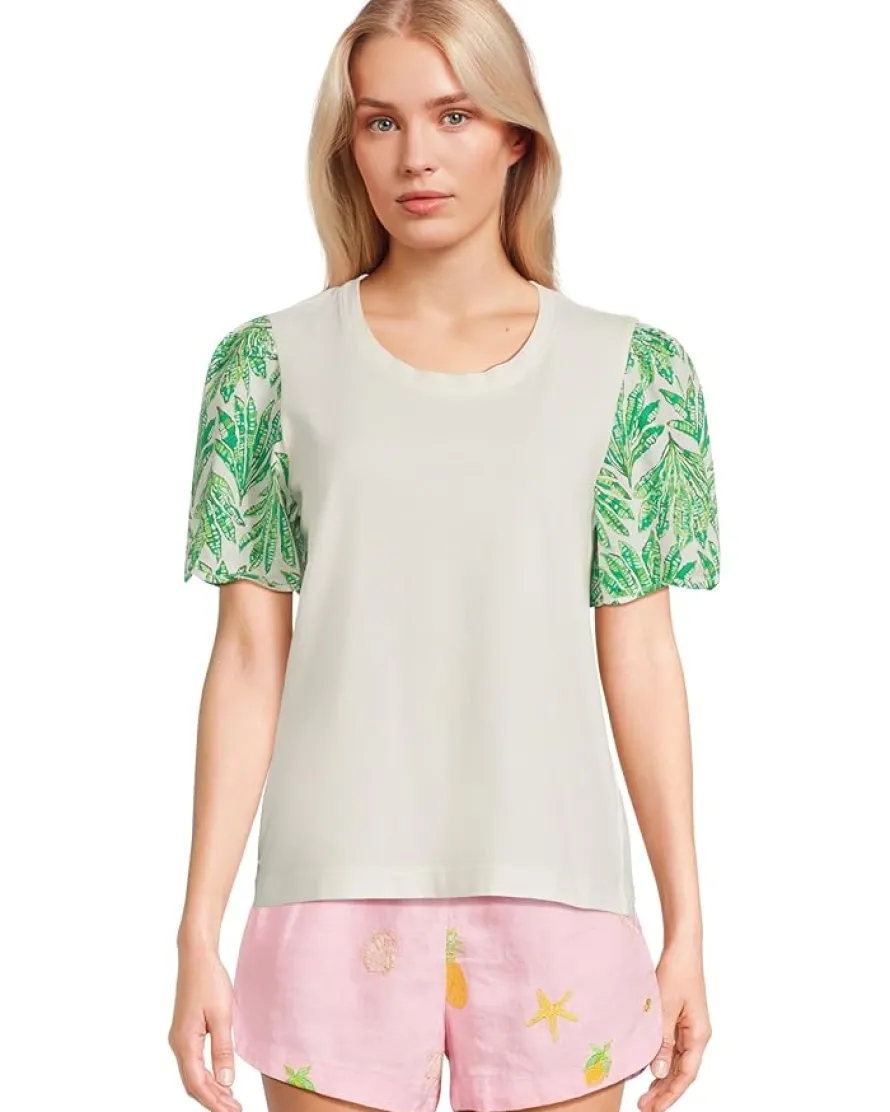 - The Lilly Pulitzer® Brittan Knit Top features a straight fit and banded crew neckline, offering a clean, flattering silhouette. The standout feature lies in its drapey short sleeves, finished with a scalloped edge that adds a touch of feminine flair.