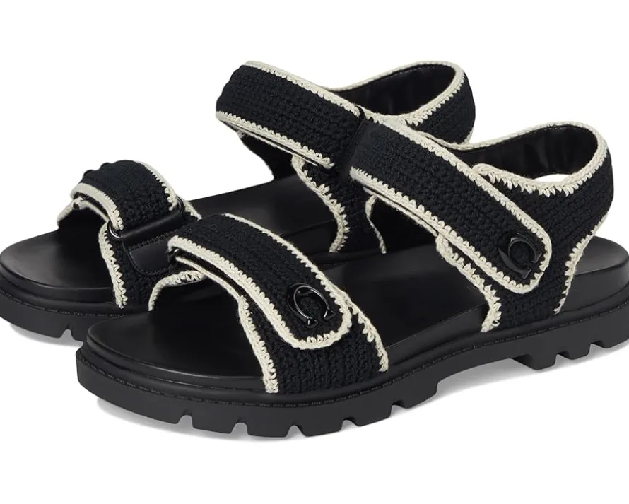 - Comfort and functionality blend together in the COACH® Brynn Crochet Sandals. Crafted with a crochet upper, man-made leather lining, and man-made leather footbed, these open round-toe sandals offer enhanced comfort with every step you take. The double hook-and-loop closure and backstrap ensure a secure fit.