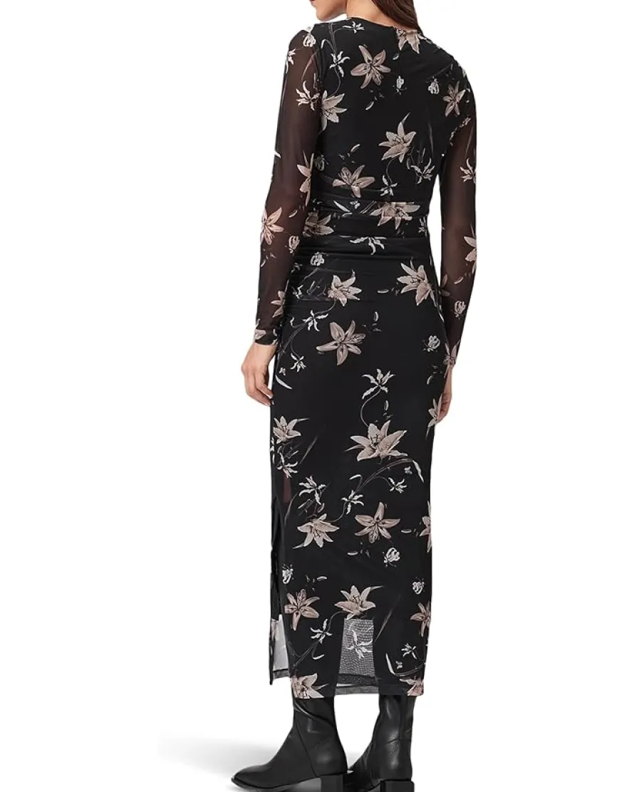 - The AllSaints™ Caia Mesh Dress is the ultimate fusion of effortless allure and modern edge. Crafted with an ankle-length silhouette, this bodycon stunner hugs your curves in all the right places, while the crew neck and long sleeves bring a sleek balance to its bold design. A delicate flower print blooms across the mesh fabric, adding a touch of romantic charm, while the ruched detailing at the waist flatters your figure with a sculpted finish.