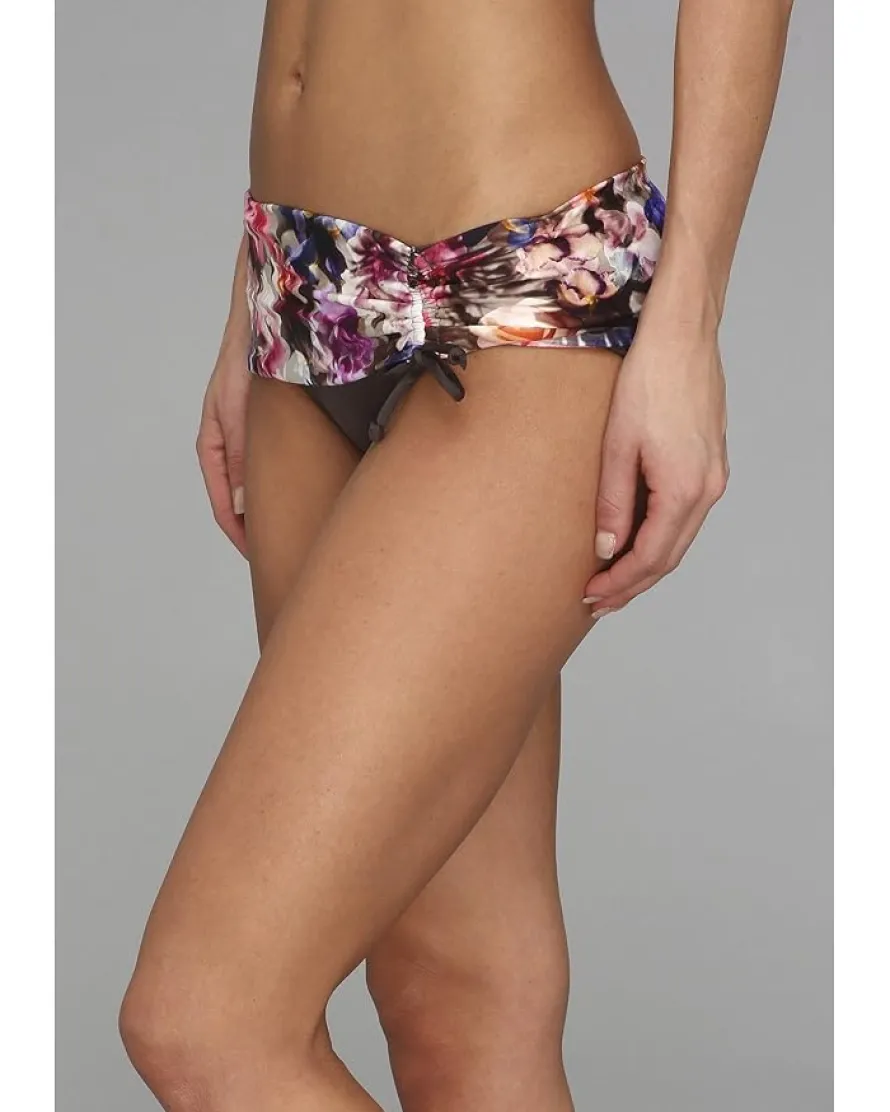 - Wide, foldover waistband with a shirred side flatters your figure and allows adjustable coverage.