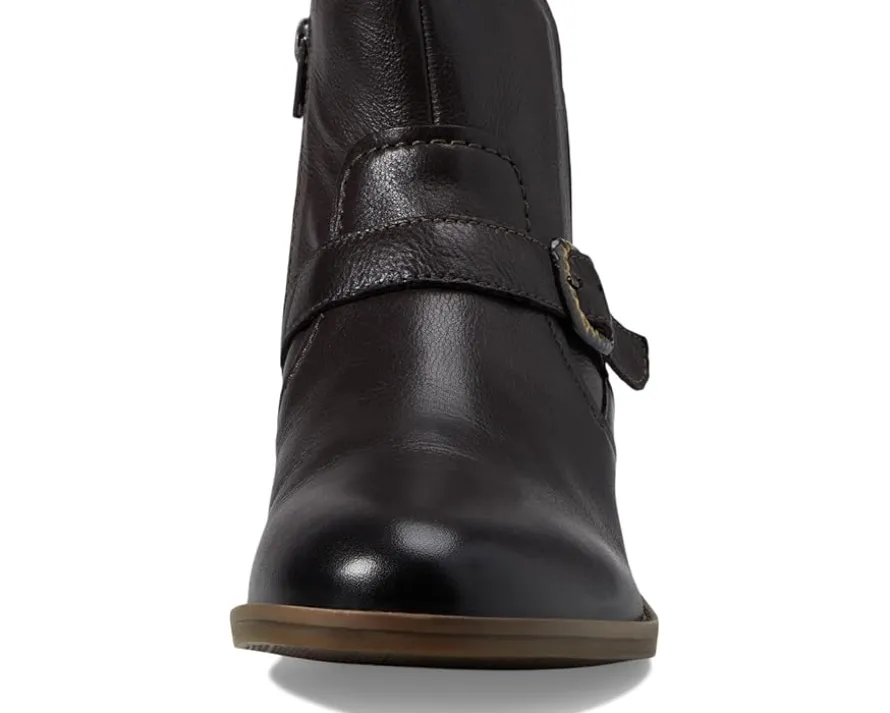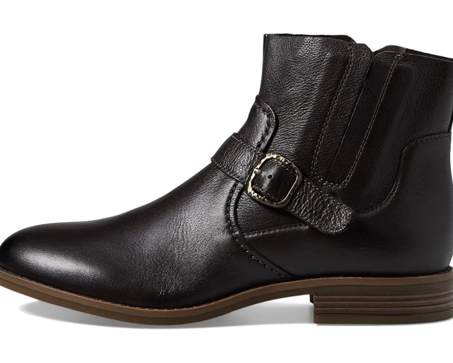 - Grab that idealized snugness and smart look wearing the Clarks™ Camzin Loop boots. This boot has a leather upper, a fabric lining, and a foam insole. This round-toe shoe design comes with a side zippered closure and buckle accent detailing on the front.