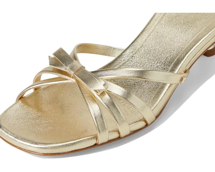 - Styled with a bow detail, the Kate Spade New York® Carolina Metallic Leather Kitten Heel Sandals are perfect to pair with your party gowns and dresses. These heeled sandals are made of a leather upper, insole, and lining. Comfortable and stylish, these slip-on heels make a great addition to your footwear collection.