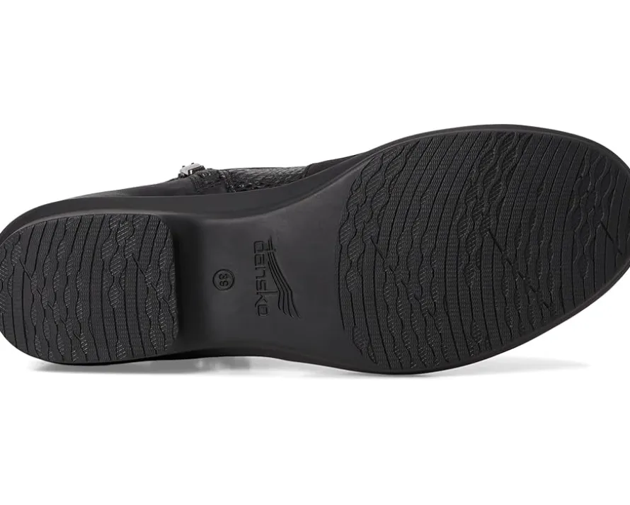- The Carolyn bootie by Dansko® is your go-to for polished style and feel-good function. Crafted with high-quality leather uppers and chrome-free leather lining, it’s as breathable as it is beautiful. The textured inlay and side buckle bring on-trend flair, while the pull-on design, goring panel, and easy side zippered offer no-fuss entry. Inside, a removable PU footbed with Dansko Natural Arch® technology delivers lightweight cushioning and all-day support, so you can strut, stroll, or slay without slowing down. The ankle-high silhouette, closed toe, and durable rubber outsole make it perfect for everyday elegance and nonstop wear.