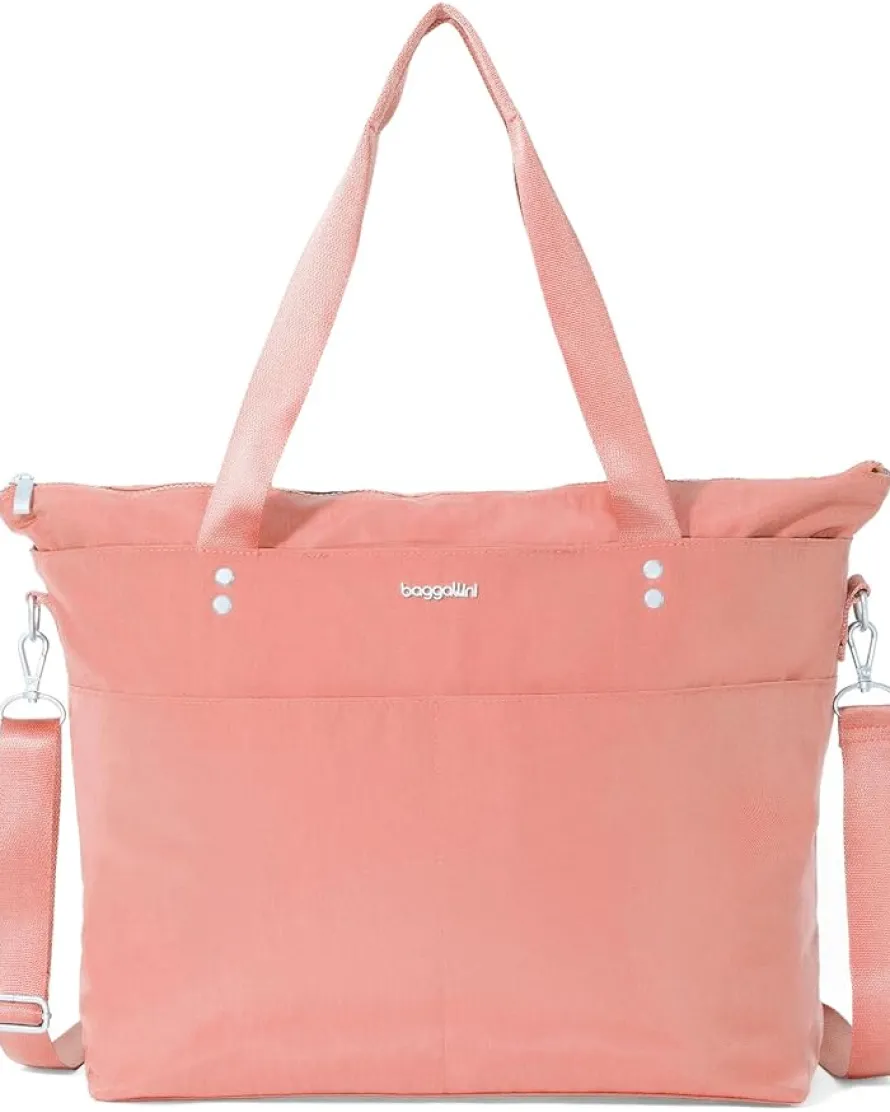 - With the ability to be worn as a shoulder bag or crossbody, this spacious Baggallini® Carryall Laptop Tote is a must-have for your work week, upcoming travels, or trips. Store your computer in the secure 15″ padded laptop sleeve. For smaller items that require fast access, exterior slip pockets and an anti-theft card wristlet have you covered. Constructed from durable nylon material, this versatile bag features a removable and adjustable crossbody strap, dual grab handles, and a zippered top closure.
