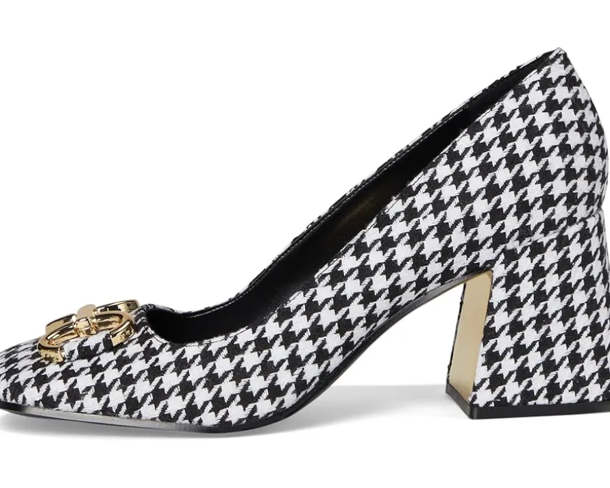 - Upgrade your footwear collection by adding the statement Nine West® Caven heels. The suede leather upper has a statement modern square toe, horsebit detailing on the upper, and a high block heel for an effortless look. The slip-on style pumps have man-made lining and a comfortable footbed that makes them perfect for all-day wear.