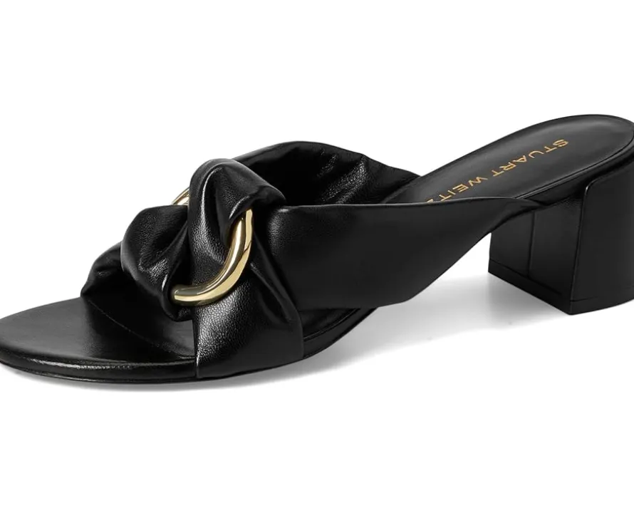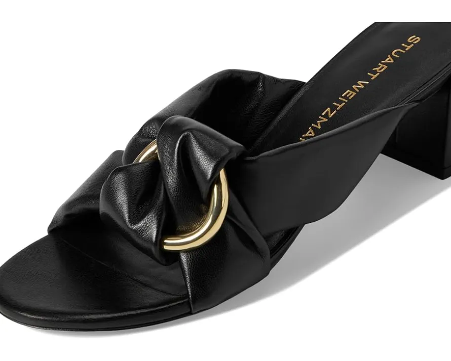 - Prepare to turn heads donning the Stuart Weitzman® Cece Block Slides 50. The knotted leather upper and goldtone ring detail add a touch of sophistication to your look. Crafted from beautiful mestizo leather and lined with plush lamb leather, these slides offer both style and comfort. Complete with leather insole and block heels for added support, these slides are perfect for any occasion with their chic open toe design.