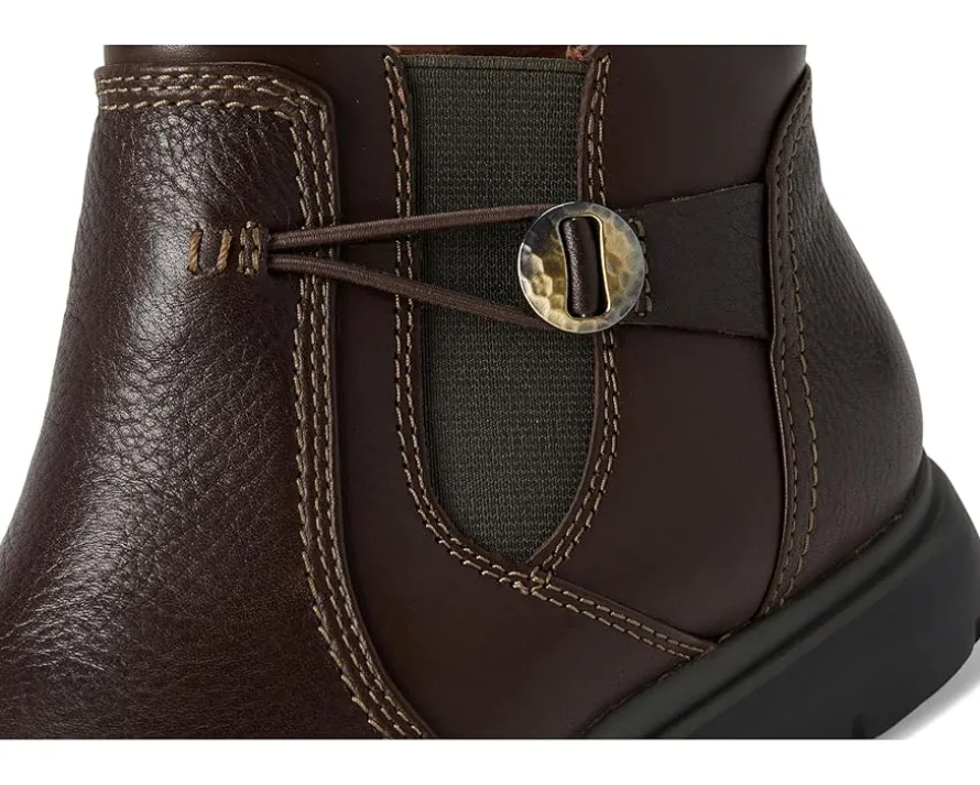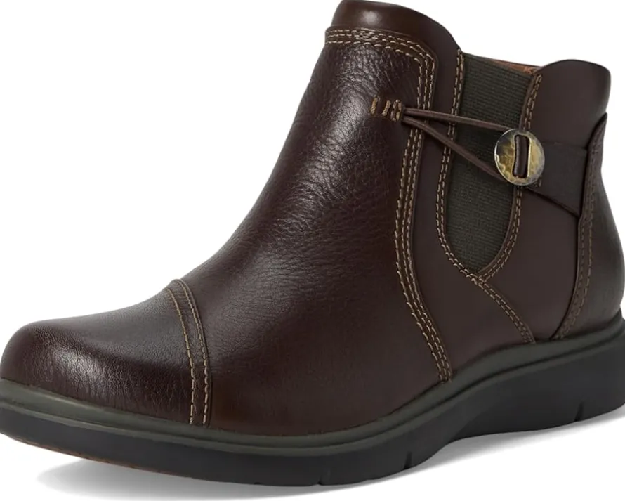 - An elasticized gore panel and side zipper for easy entry accentuate the Clarks® Certina Joy Ankle Boot. Featuring a roomy round toe shape, the footwear has leather upper, lining, and suede insole.