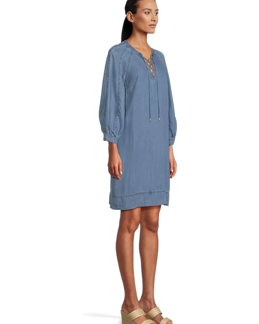 - The Tommy Bahama® Chambray O’lei Lace-Up Dress features long sleeves with cuffed detailing, a lace-up V-neckline, and an embroidered hemline that adds a touch of artisanal charm. The lightweight drape ensures comfort and movement, making it perfect for outings or casual gatherings.