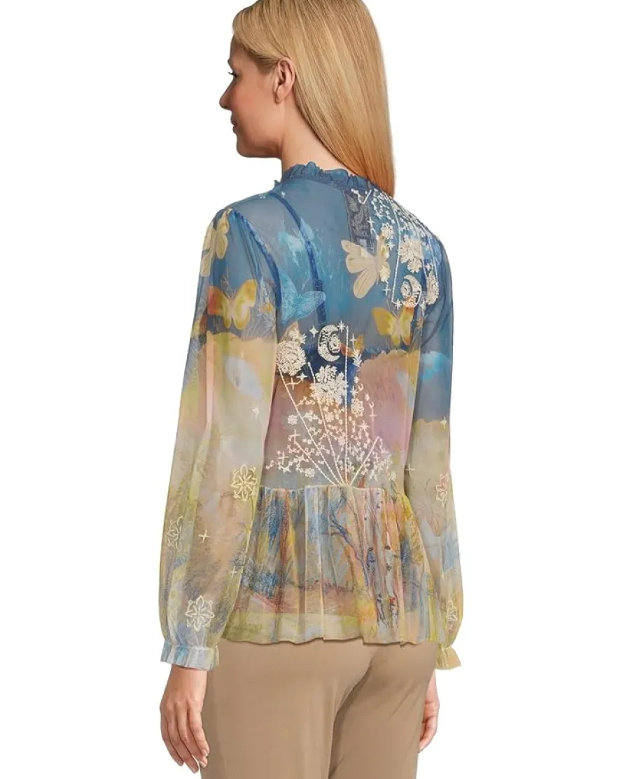 - Boho-chic vibes meet effortless elegance in the Johnny Was® Charlot Mesh Blouse (with slip), a dreamy piece designed to turn everyday dressing into an art form. Crafted with a lightweight mesh overlay and a slip for easy wear, this blouse captures attention with its vibrant printed design that feels both timeless and on-trend. The round neckline with button-front closure adds a delicate touch, while the long sleeves with elasticized cuffs bring in a hint of romantic flair. A charming ruffled hem completes the look, creating graceful movement with every step. Designed as a pull-on style, it offers convenience without compromising sophistication, making it a perfect blend of comfort and style.