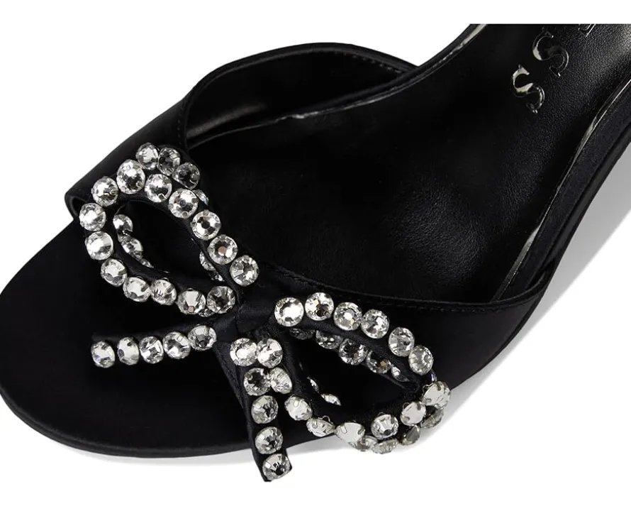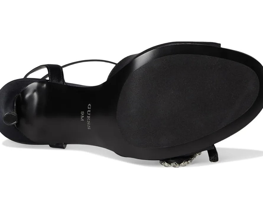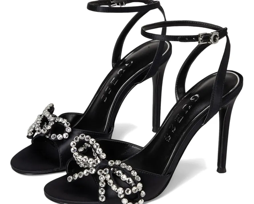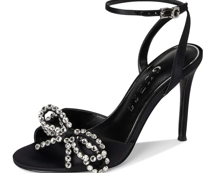 - Make your statement wearing GUESS® Charmin. These show-stopping dress sandals feature a denim upper adorned with dazzling rhinestones and a playful tubular bow, perfect for turning heads at every occasion. The open-toe silhouette and stiletto heel exude elegance, while the adjustable buckle ankle strap ensures a secure, customized fit. Inside, a cushioned insole delivers all-day comfort, and the flexible synthetic rubber outsole moves with every step, letting you dance, strut, and celebrate in style. A modern twist on timeless glamor, Charmin blends youthful energy with sophisticated flair, reflecting GUESS’s legacy as a global lifestyle brand since 1981.