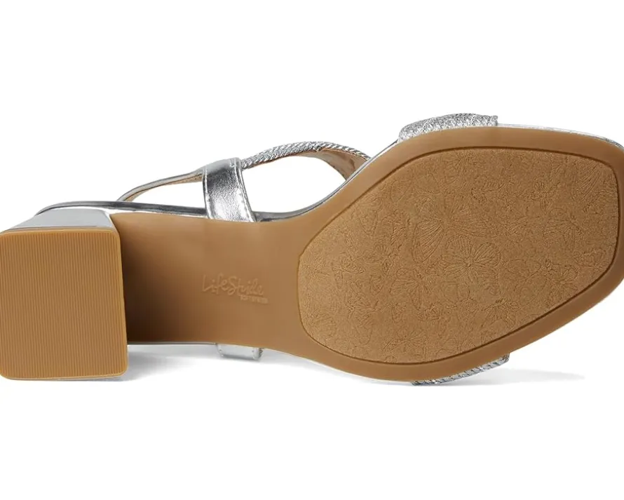 - Shine with every step in these stunning LifeStride® Charnelle block heels featuring rhinestone accents. Crafted from faux leather upper, this square toe style boasts a slingback strap with an adjustable buckle for a perfect fit. These heels are designed with linings made from partially recycled materials. Experience unparalleled comfort with trusted Soft System® technology, providing unmatched cushion, support, and flexibility in every pair. The ultra-flexible, padded platform heel offers enhanced flexibility for effortless movement.