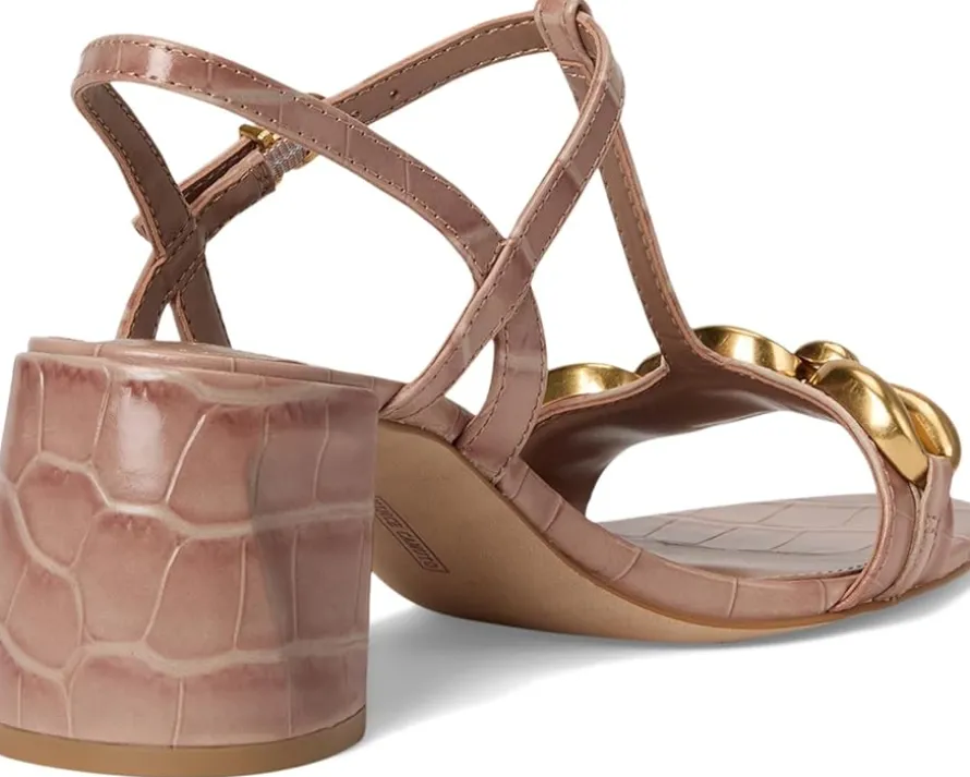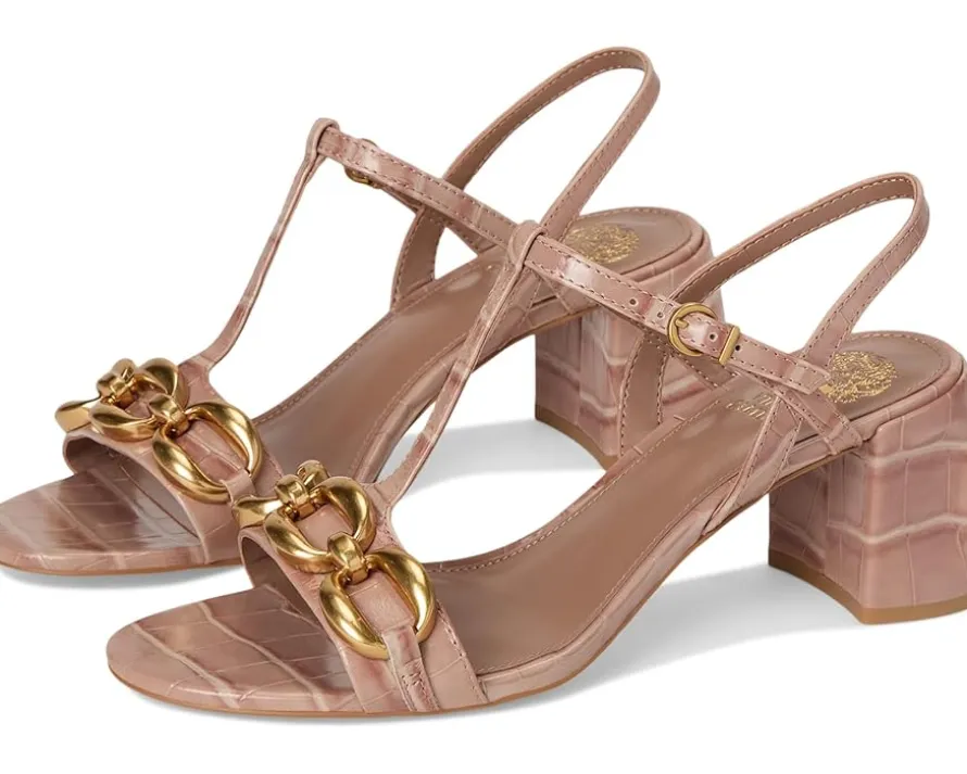 - Chain link charm redefined in the Vince Camuto® Chirie Chain Link Block Heel Sandals. Crafted from refined crocodile-embossed leather in a dreamy chai latte hue, this sandal radiates modern charm from every angle. The open-toe T-strap silhouette features a graceful ankle strap with a gold-tone buckle for a secure, customized fit, while the bold gold chain detail across the vamp adds eye-catching polish. A sturdy block heel offers wear-all-day comfort without compromising style.